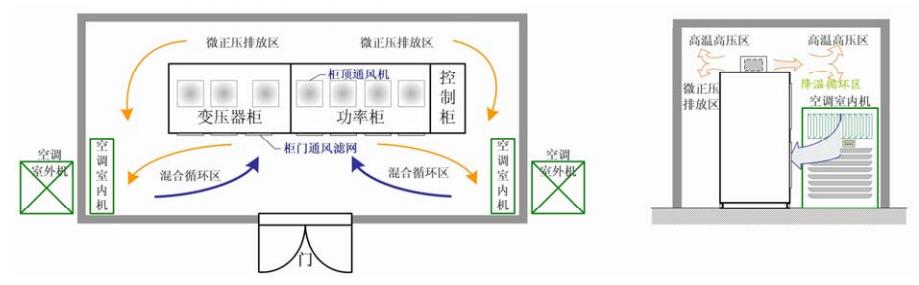 為了提高高壓大功率變頻器的應用穩定性,解決好高壓變頻器環境散熱問題。目前常用的辦法是:密閉式空調冷卻。該方法主要是為高壓變頻器提供一個固定的具有隔熱保溫效果的房間,根據高壓變頻器的發熱量和房間面積大小計算出空調的制冷量,從而配備一定數量的空調。采用空調冷卻時,房間的建筑面積過大會增加空調冷卻負荷。同時,由于變頻器排出的熱風不能被空調全部吸入冷卻,因此,造成系統運行效率低,造成節約能源的二次浪費。變頻器室內的冷熱風循環情況如下圖所示。