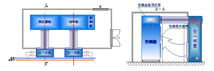 1) 設備安裝簡單、快捷。整體式的結構組件安裝于變頻器室外,室內采用風道與變頻器柜頂排氣口直接連接,使得整個空-水冷卻系統結構緊湊,便于安裝。