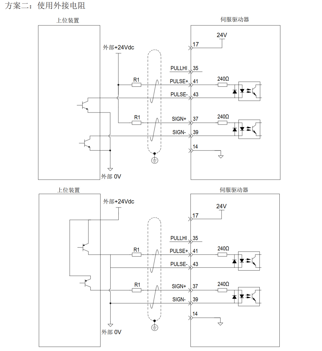 也可采用外接電阻的接線方案,當脈沖和方向信號為5V時,不需要接電阻,當脈沖和方向信號為24V,R1和R2必須接2KΩ左右的電阻,否則會造成驅動器損壞。