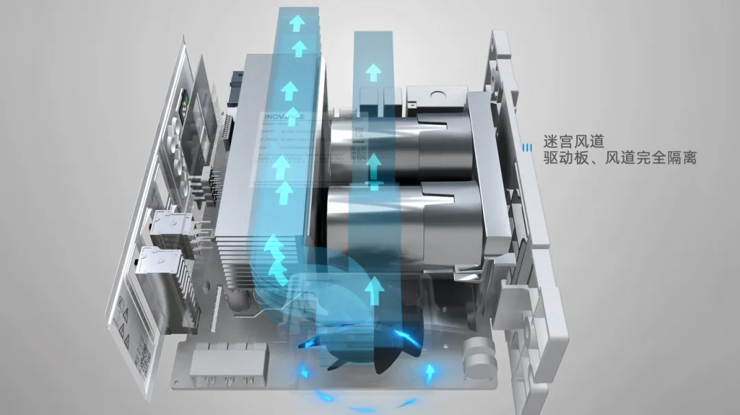 MD600采用迷宮風道設計,風道與驅動板完全獨立,加上100%三防漆,有效防止雜質、粉塵等進入驅動板內部,保障在惡劣環境中的可靠運行。MD600還可自定義正反轉,有效防止棉絮等異物堵塞風道。同時采用無驅風扇,風扇驅動集成在驅動板內部,增加易損件的可靠程度。