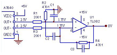 現測U1的輸入、輸出端電壓均為2.5V,判斷U1是好的,故障為U1偏置電路或A7840異常所致。測A7840的6、7腳輸出電壓均為2.5V,正常。故障局限于R1、R2分壓電路異常,如R2虛焊或斷路,將導致2.5V的故障電壓輸出。