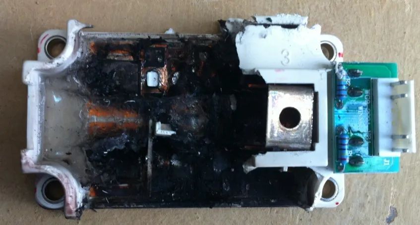因為某些原因,模塊的損耗十分巨大,熱量散不出去,導(dǎo)致內(nèi)部溫度極高,產(chǎn)生氣體,沖破殼體,這就是所謂的IGBT爆炸。