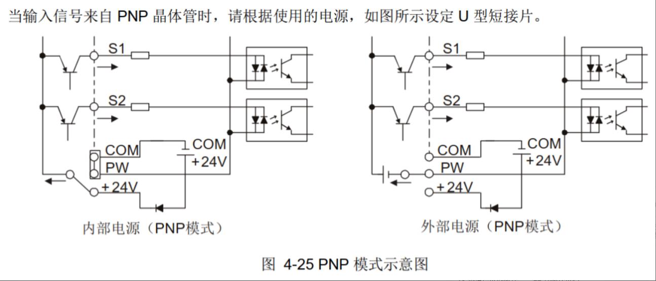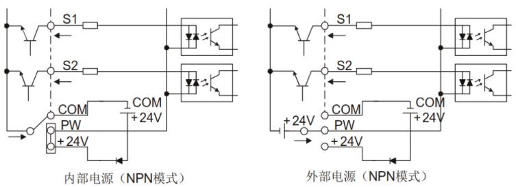 變頻器S(DI)端子的公共端PW和內部電源的負極COM短接,通過虛線左側的外部電路使內部電源的正極與S端子接通,電流即可形成回路,S1端子輸入為真。