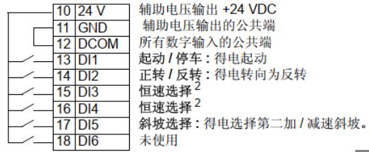 將變頻器的啟停命令源設置為端子啟停,使電源流經變頻器的DI端子形成回路即可通過光耦觸發變頻器的DI輸入端為得電狀態。
