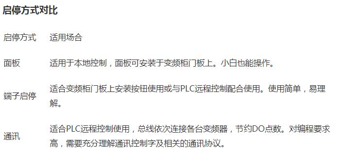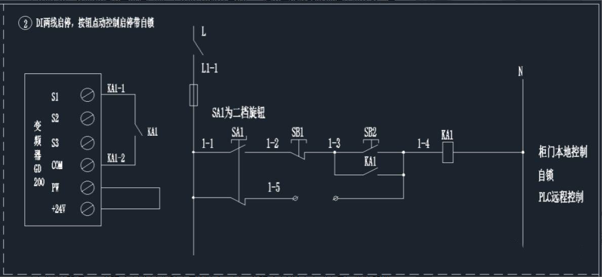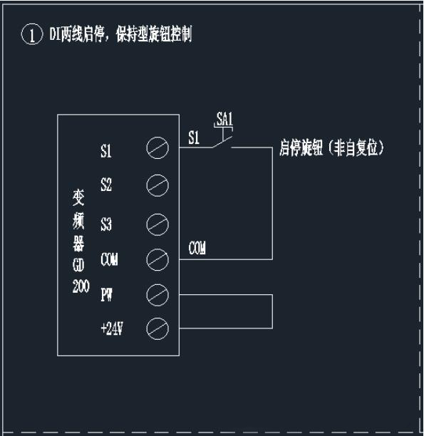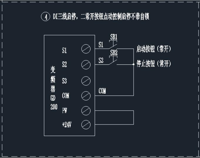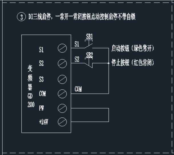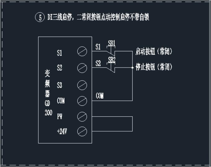 通常情況:通俗的描述就是當停止按鈕未被按下時,啟動按鈕被按下,變頻器運行;啟動按鈕松開后變頻器保持運行狀態;停止按鈕被按下,變頻器停止;停止按鈕松開后,變頻器保持停止狀態。