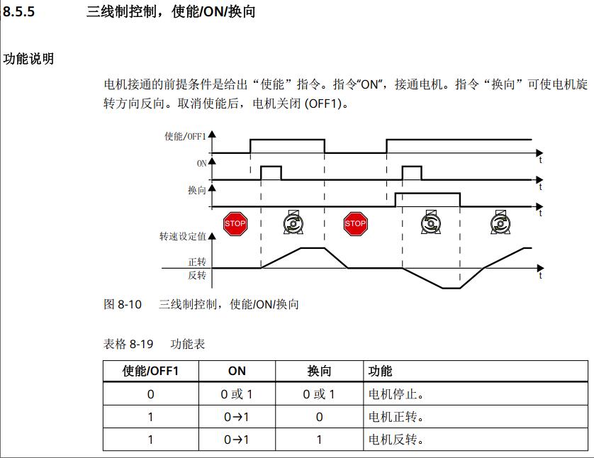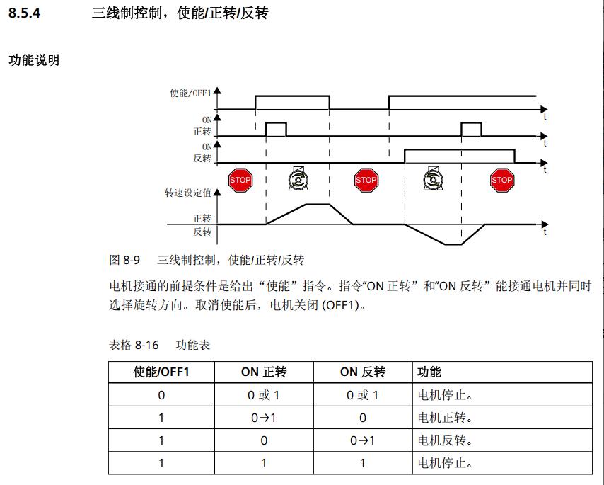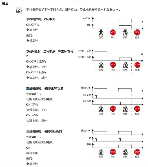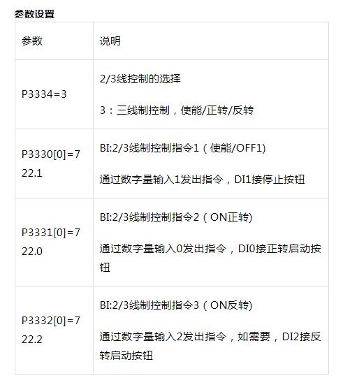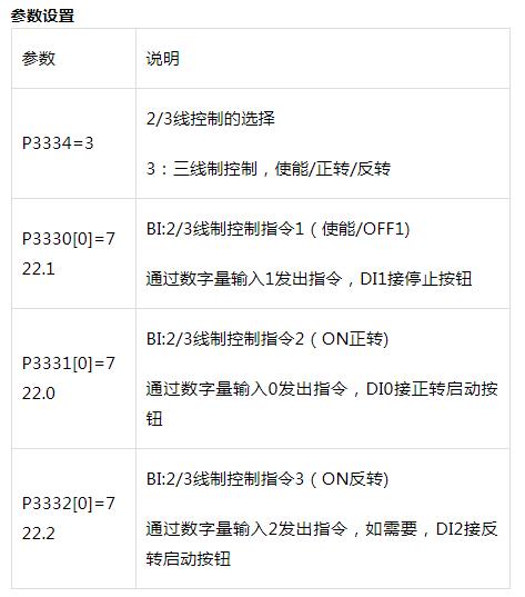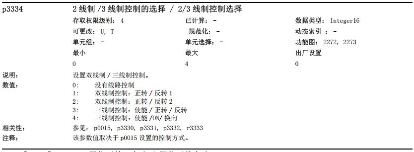 通過參數P3334進行選擇,然后通過參數P3330,P3331,P3332參數連接至r722數字量DI輸入狀態即可實現兩線,三線控制。