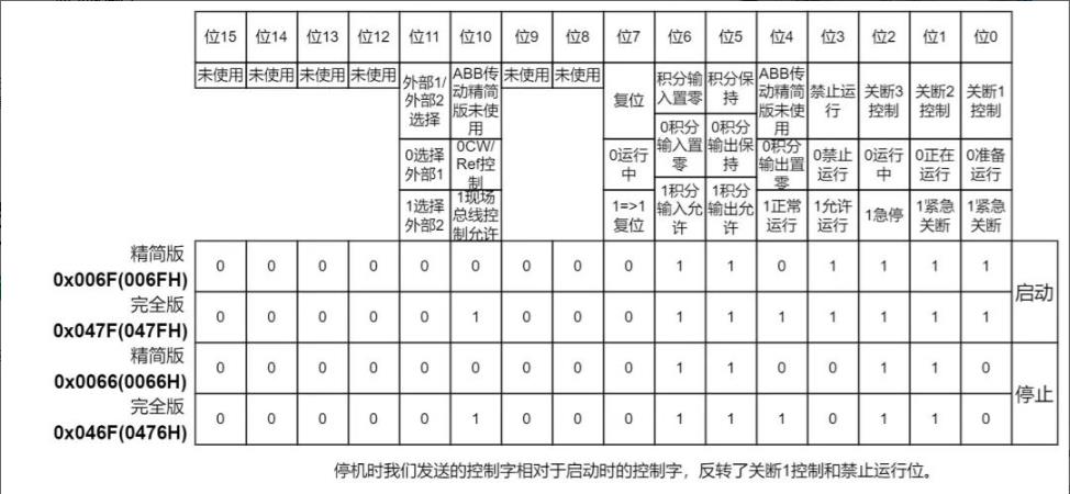 通訊控制字必須存儲在一個Modbus寄存器中,而每個寄存器都有一個地址。按位配置好我們所需的功能,將控制字的二進制數值換算為16進制,寫入變頻器的控制字寄存器地址即可控制變頻器的啟停。
