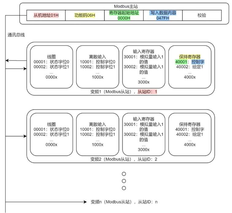 主站通過通訊總線向所有從機發送Modbus報文,將控制字的內容寫入指定的從站的指定寄存器中。如圖中所示主站發送的報文所有從站都可以收到,但只有與報文中的從機地址相符的從站中指定寄存器的值會改變并返回相應的報文,其他從機地址不匹配的從站寄存器中的控制字內容不會改變,也不會返回報文。