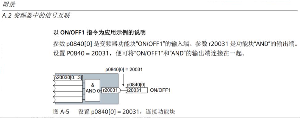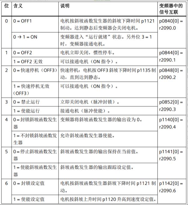 上表中最右側的列中列出了每個功能的參數地址,例如p0840[0]表示ON/OFF1參數,而r2090.0則代表控制字的第0位。設置p0840[0]=r2090.0就將ON/OFF1和控制字的第0位關聯起來,用現場總線改變控制字的第0位就相當于改變了ON/OFF1的值,就可以控制變頻器的啟停。