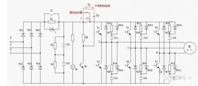 檢查變頻器輸入側(cè)和負(fù)載側(cè)均問題,斷開負(fù)載側(cè)故障仍出現(xiàn)過壓故障,可以判斷變頻器內(nèi)部故障。電壓檢測信號的信號采集,多取自中間直流回路 PN 端 530V 直流電壓,所以最直接的檢測方法就是用直流電壓表測量中間直流母線的電壓。直流母線電壓低,可能是電源輸入電壓低或整流電路出現(xiàn)斷路;直流母線電壓高,可能是電源輸入電壓高或者電動機(jī)出現(xiàn)電能回饋;如果直流母線電壓正常時(shí),變頻器報(bào)出電壓過高,首先考慮的是用電壓表檢測電路是否發(fā)生了損壞。
