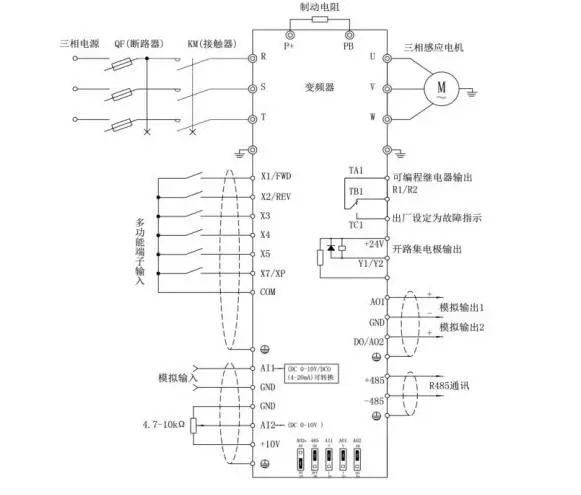第三類模擬量給定,將頻率源參數設置為349其中一個就可以,這個是用的最多的,其本質就是建立起模擬量和頻率范圍的比例關系,比如我給定模擬量為0-10V對應變頻器啊給定頻率為0-50Hz,那么當我給定模擬量為5V時其輸出頻率就為25Hz,通常給定模擬量的方法有很多種,可以直接通過PLC或者其它能輸出模擬量的控制器給定,當然也可以通過電位器和變頻器本身的10V電源實現0-10V的給定,點位器本質就是個滑動變阻器,通過改變阻值改變分壓值從而控制0-10V電壓的變化,變頻器面板上的調頻旋鈕其實就是個電位器,當然通過模擬量端子接線時要具體看說明書上的接線圖,如果對于數字量和模擬量還不清楚可以看一下我這篇文章:
