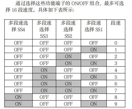 第四類多段速給定,其實就是通過控制變頻器的幾個DI端子,通過不同組合狀態來實現以相應的設置好的頻率運行,假如我定義好DI1DI2端子為多段速控制端子,那么兩個端子就會組合成四種狀態,分別為00、0110、11,在變頻器啊中分別定義好四種狀態對應的頻率值,假設分別為10Hz、15Hz25Hz、40Hz,那么當DI10,DI21時變頻器就會輸出頻率為15Hz,其它組合同樣道理,通過不斷切換這兩個輸入點的狀態就可以控制變頻器對應的頻率運行。