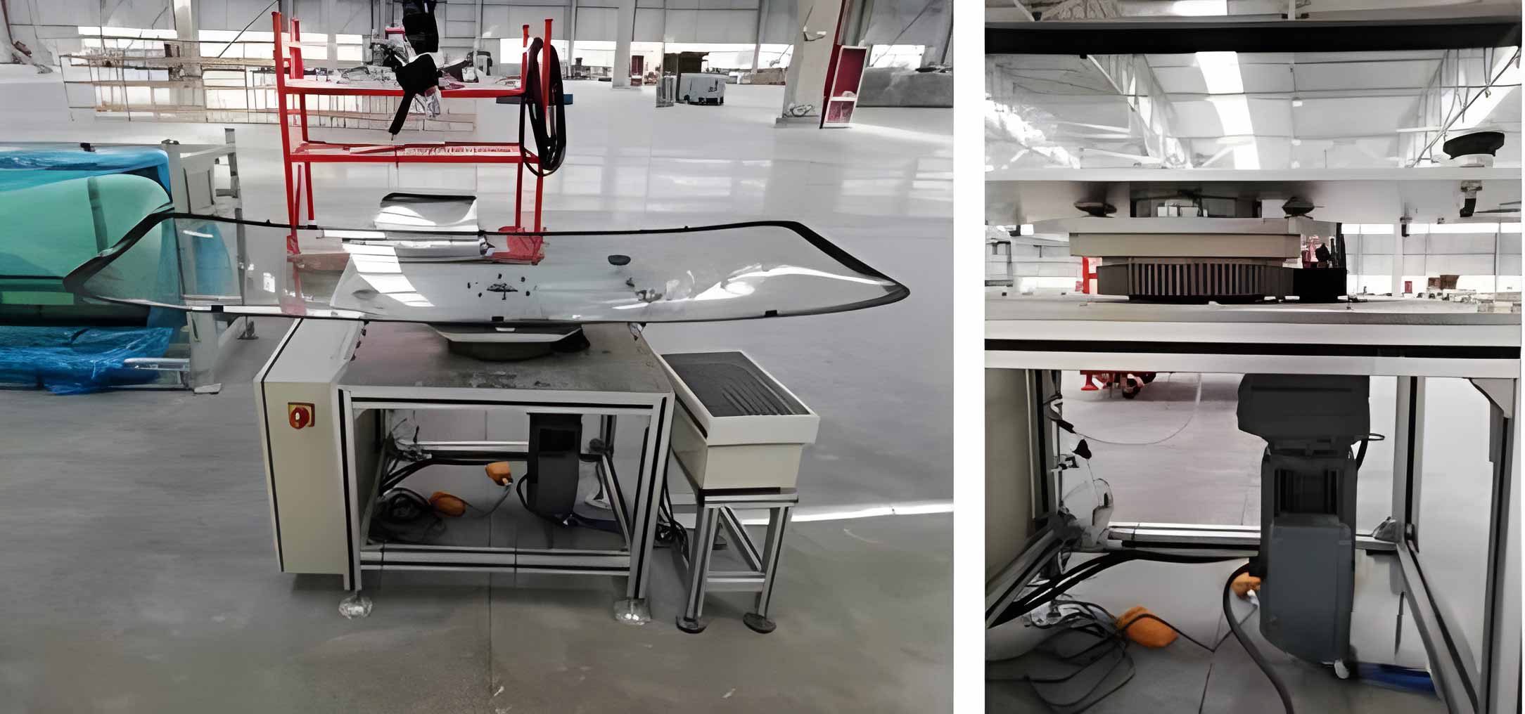 如上圖所示,這是一個手動涂膠臺。由腳踏開關控制變頻器,變頻器再驅動旋轉電機,從而使玻璃旋轉至需要的方位。