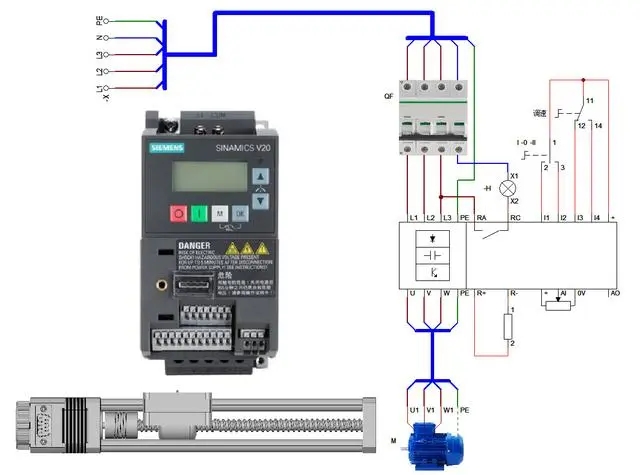 控制要求:變頻器外接按鈕SB1、SB2,SB1為三擋旋鈕開關,用來控制電機的正反轉,左檔位置電機正轉,中間位置(圖示位置)為停止,右檔位電機正轉,SB2為兩檔擋旋鈕開關,左檔位置(圖示位置)變頻器輸出頻率為低速(20Hz),右檔位置變頻器輸出頻率為高速(40Hz)。