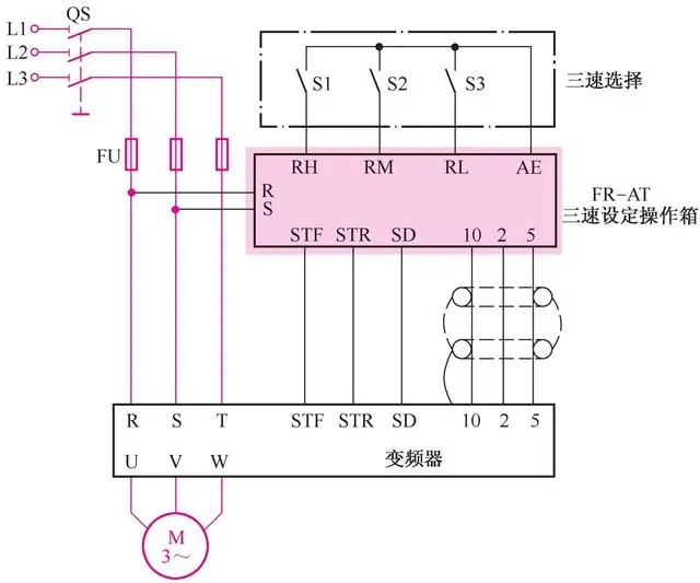 具有三速設定操作箱的變頻器調速線路如圖4-2所示, 它適于拋光、研磨、 攪拌、 脫水、 離心、 甩干、 清洗等機械設備在需要多段速度的工序中采用。 圖中FR-AT為三速設定操作箱, 它與變頻器之間須用屏蔽線連接。 通過S1、 S2、 S3這3個手動開關控制, 可以實現三速選擇。