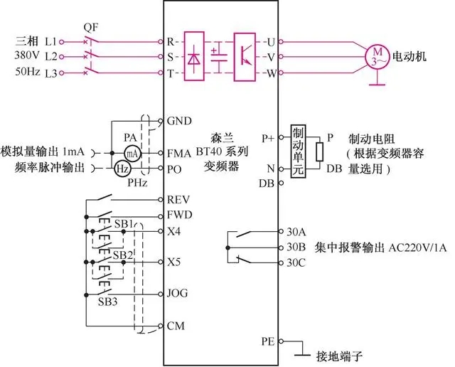 目前變頻器作為新穎的電氣設備, 在實際工作中得到了廣泛應用, VFD-007V23A變頻器接線線路就是實際應用線路之一, 如圖4-3所示。