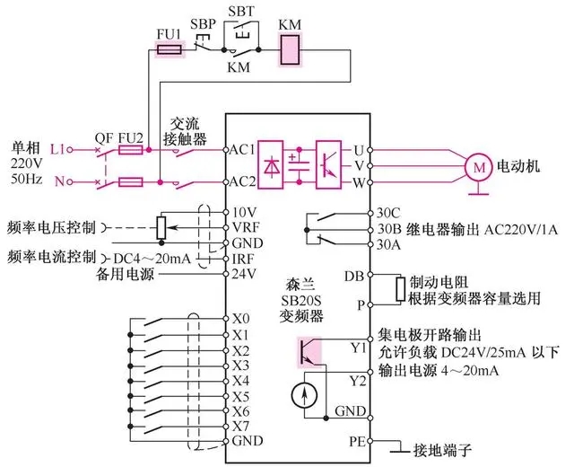 變頻控制有很多好處, 例如三相變頻器通入單相電源, 可以方便地為三相電動機提供三相變頻電源。 線路如圖4-5所示。