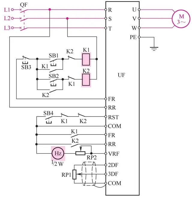 正轉時, 按下按鈕SB1, 繼電器K1得電吸合并自鎖, 其常開觸點閉合, FR-COM連接, 電動機正轉運行;停止時, 按下按鈕SB3, K1失電釋放, 電動機停止。