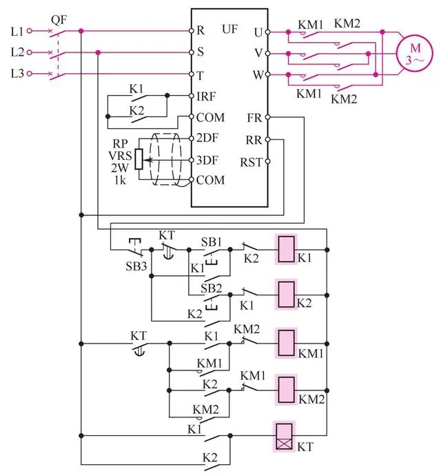 欲使M反轉, 在IRF-COM接通后, 變頻器UF開始運行, 其輸出頻率按預置的升速時間上升至給定的相對應數值。 當按下停止按鈕SB3后, K1失電釋放, IRF-COM斷開, 變頻器UF輸出頻率按預置頻率下降至0, M停轉。 按下反轉按鈕SB2, 則反轉繼電器K2得電吸合, 使接觸器KM2吸合, 電動機反轉運行。