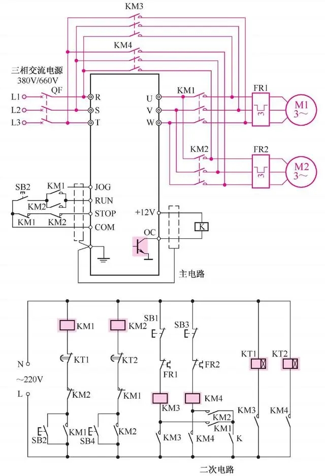 按下二次電路中的SB1、 SB3則M1、 M2停止運行。