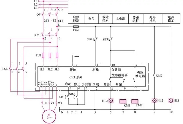 CR1-30~CR1-450電動機軟啟動器線路如圖4-11所示。 圖中QF為斷路器;FU1為快速熔斷器;KM1、 KM2為交流接觸器, 其中KM2為旁路接觸器;SB1為啟動按鈕, SB2為軟停按鈕, SB3為電動機急停按鈕, SB4為控制電源復位按鈕;HL1為電源指示燈, HL2為旁路指示燈, HL3為故障指示燈。