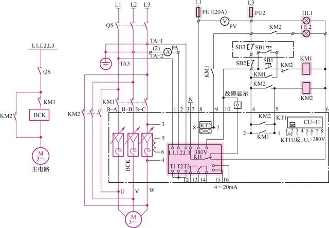 BCK箔式繞組磁控式電動機軟啟動器是一種交流異步電動機軟啟動裝置, 可減輕電動機啟動時對電網的沖擊擾動, 降低對電網容量的要求。 它采用繼電器、 可編程序控制器 (PLC) 或單片機控制系統,實現對異步電動機啟動過程和運行方式的手動與自動集中和就地控制,具有低耗節能、 適應重載啟動等優點。 BCK箔式繞組磁控式電動機軟啟動器線路如圖4-10所示。