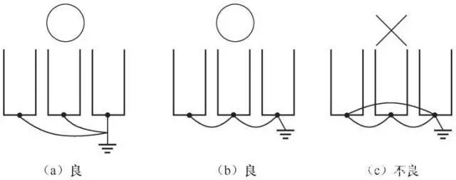 (5)從安全及降低噪聲的需要出發,變頻器必須接地,接地電阻應小于或等于國家標準規定值,而且要較粗的短線接到變頻器的專用接地端子上。當數臺變頻器共同接地時,勿形成接地回路,見圖10-9。