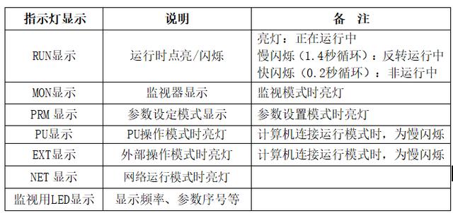 3、操作面板單位表示及運(yùn)行狀態(tài)表示見下表