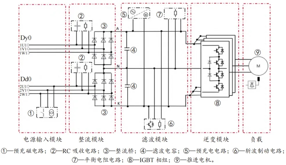 該變頻器為 24 脈沖2.2 kV 矢量控制,交 - 直 - 交中壓變頻器,主回路為中性點鉗位(Neutral Point Clamp,NPC)三電平結構,其關鍵元器件為絕緣柵雙極型晶體管(Insulated Gate Bipolar Transistor,IGBT), 該 變頻器結構緊湊、諧波含量低、輸出電壓更高,非常適合船舶電力推進系統使用。該變頻器的 24 脈沖整流部分由兩組 12 脈沖整流輸出并聯組成。