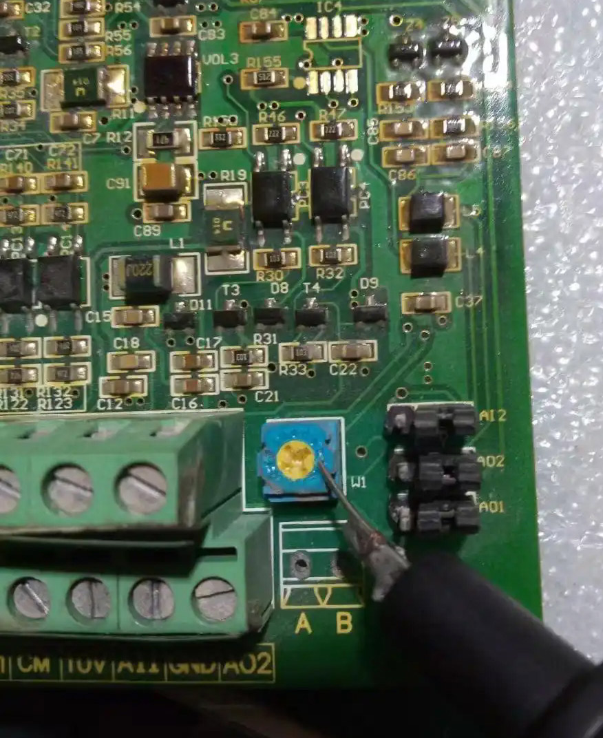 此電位器廠家原本封膠,維修時清除了此電位器是0到10k數(shù)值,于是調(diào)節(jié)發(fā)現(xiàn)其阻值變小后,母線檢測電壓果然上升了。但阻值調(diào)到0歐后,其母線電壓檢測最終只有420v,與實際電壓相差甚遠。