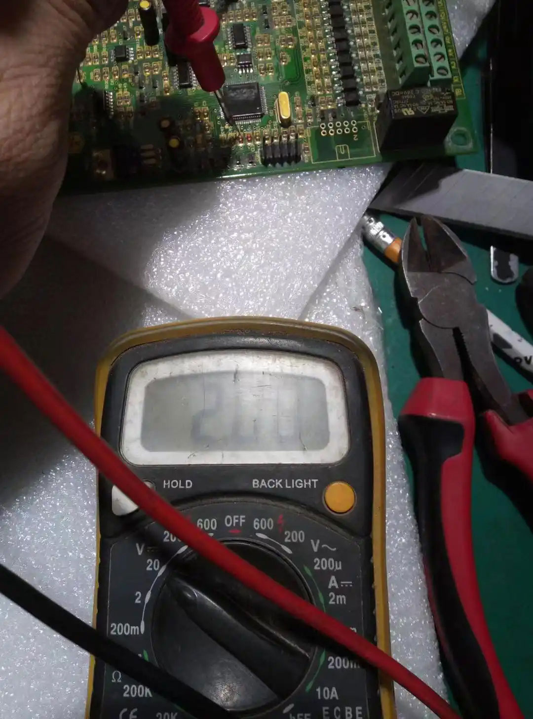 白色的芯片是A7840光藕變頻器母線電壓檢測,有的是串聯(lián)幾個大電阻直接從母線采樣,有的是從開關(guān)電源二次側(cè)間接采樣。端著板子查看一番,發(fā)現(xiàn)有幾個電阻從母線分壓,到A7840光耦上,從a7840光耦輸出但tl072c運算放大器,再經(jīng)過底部一個電位器。此電位器廠家用固體膠封住的,意思就是不讓使用者隨便亂調(diào)。從電位器輸出后,又到了一個tl072c,這里的tl072c不在起放大作用,而是個電壓跟隨器,經(jīng)過再次隔離輸出后,來到CPU某引腳,推測這個可能就是母線電壓檢測的最終電壓。搭上萬用表,測量其電壓只有1.75v左右,斷電后其電壓值隨著母線電壓下降,而呈現(xiàn)出線性下降,可以確定這個就是母線電壓最終檢測點,而那電位器應(yīng)該就是起廠家校準母線電壓與實際電壓數(shù)值的作用。