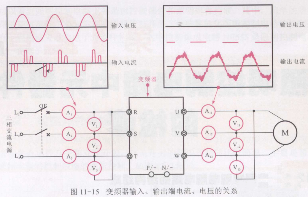 變頻器輸入、輸出端電流、電壓的關系如圖11-15所示。主要注意的是,大多變頻器本身都有故障顯示功能,通過識別其故障代碼可較直觀地了解其故障部位和原因,并針對不同的故障原因,采取相應的檢修措施,排除故障。